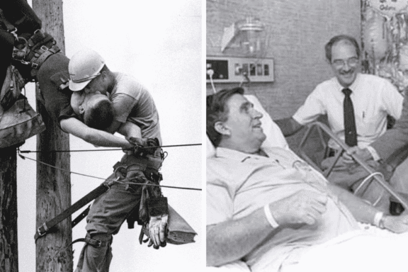 Rocco Morabito took this picture in 1967. It’s dubbed “The Kiss of Life.” It shows J.D. Thompson, a utility worker, giving mouth-to-mouth to his coworker Randall G. Champion after he passed out after touching a low voltage wire. While doing normal maintenance, Champion accidentally touched one of the low-voltage cables at the top of the utility pole. His safety gear…