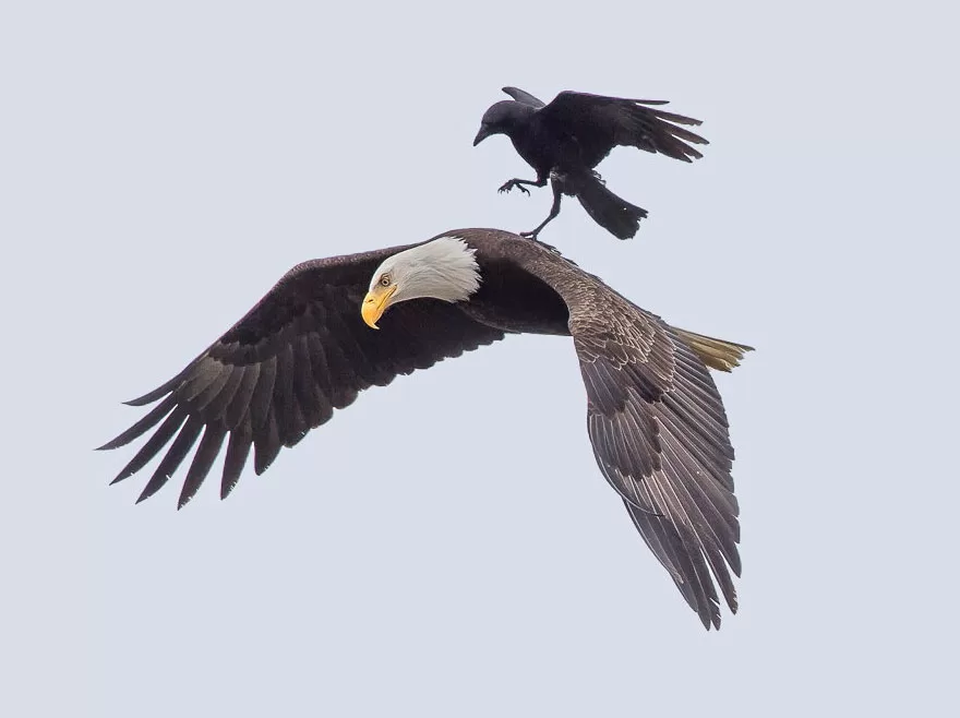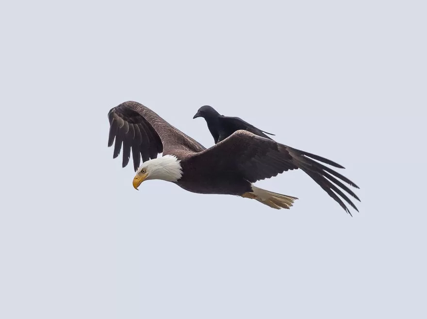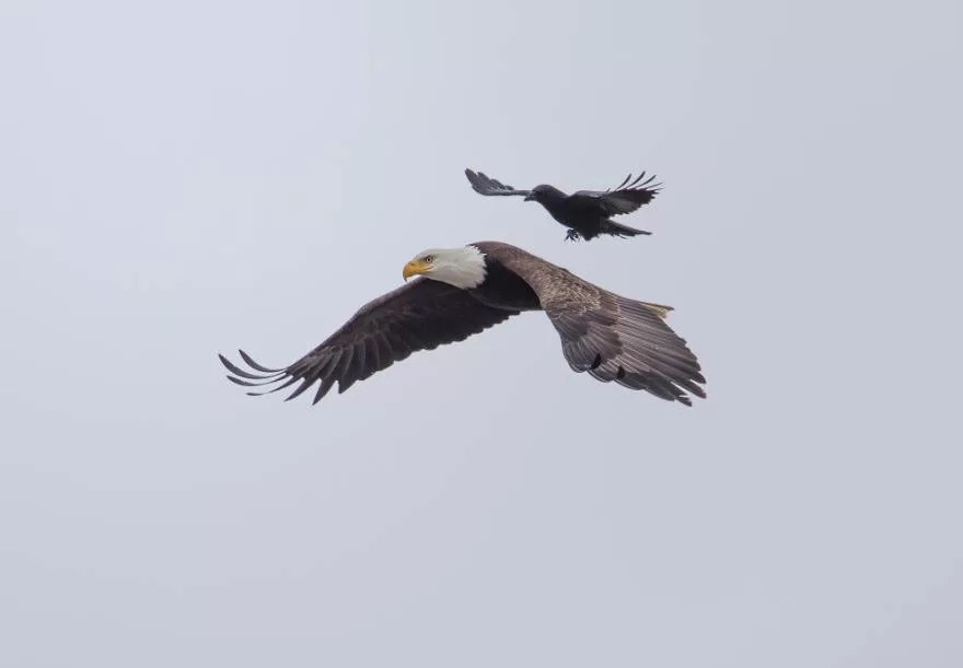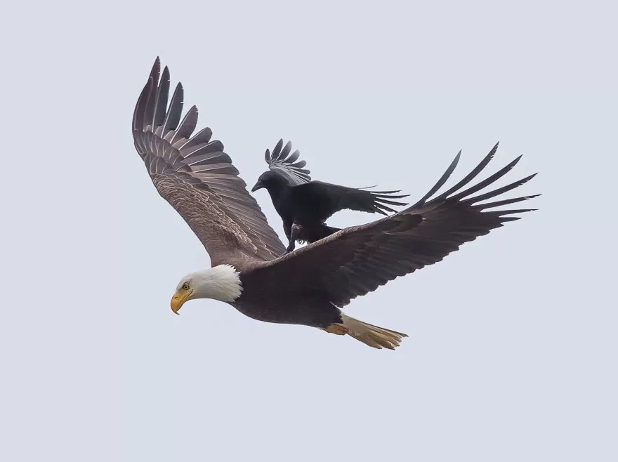 Phoo Chan, our photo ninja, calls California home, and he’s got the inside scoop. He says, “Crows usually have this tough-guy reputation when it comes to bigger birds stepping into their turf. But here’s the kicker: in these pics, the crow’s just chilling on the eagle’s back, and the eagle’s like, ‘Yeah, buddy, feel free to invade my personal space!'”
