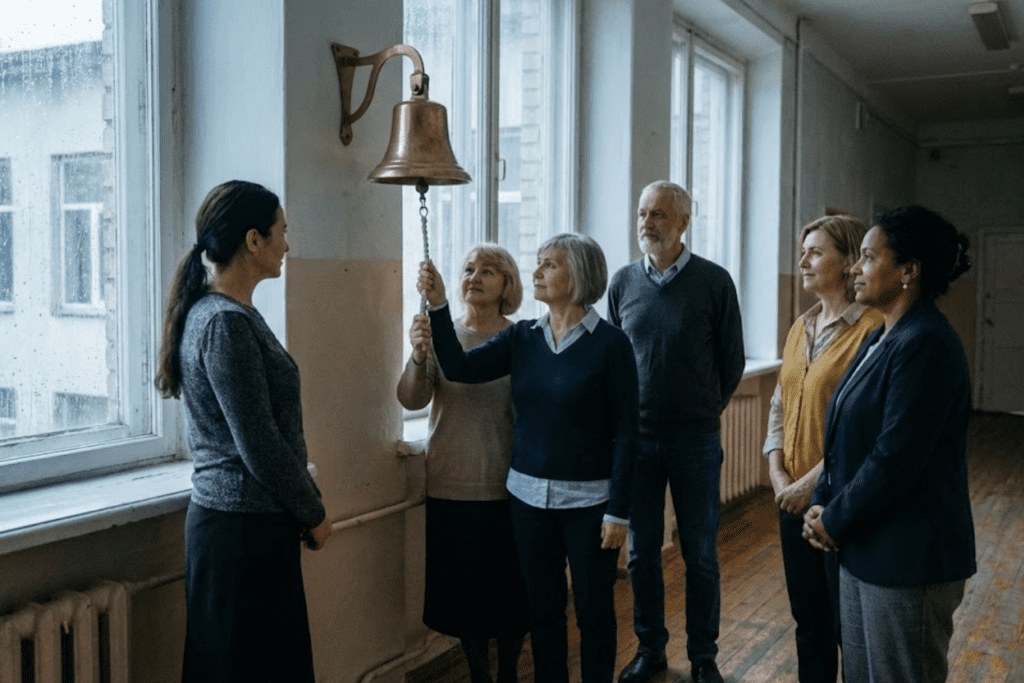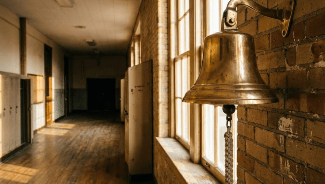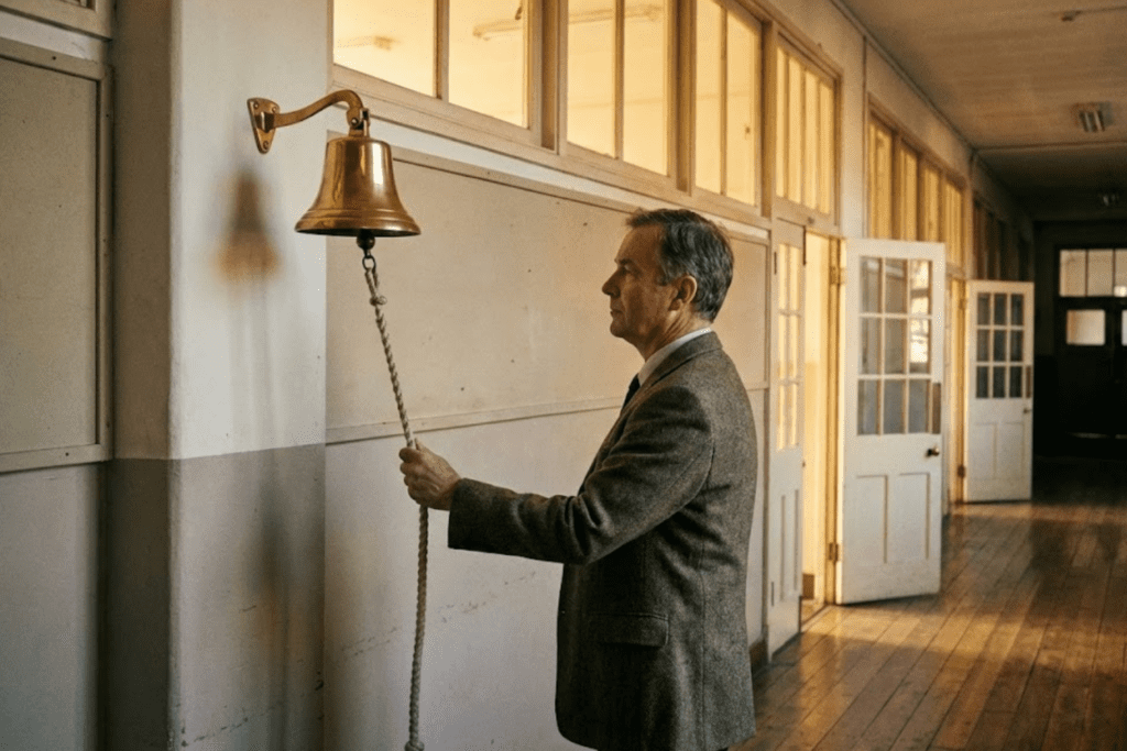 Sometimes the chime came from the front office. Sometimes from the science wing. Once, the art teacher rang it while still wearing a paint-splattered apron. No matter who pulled the rope, the sound carried the same weight.