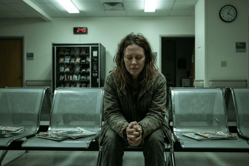 In the emergency waiting room, the fluorescent lights buzzed softly, casting everything in a pale, unreal glow. A television in the corner played a muted news channel no one was watching. Coffee cups sat half-empty on plastic tables.