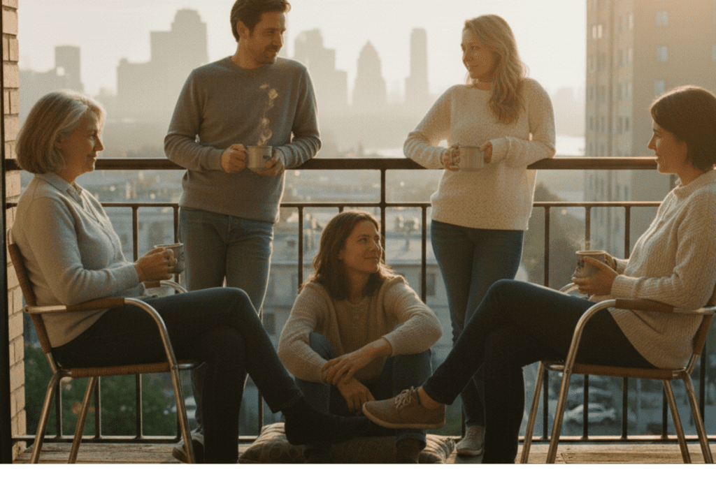 A woman from the third floor who walked her cat in a stroller and waved shyly at first, then stopped to say hello. A college kid who lived in 5A and started bringing his coffee out with him, sitting on the opposite end of the balcony like he was testing the idea of being part of something.
