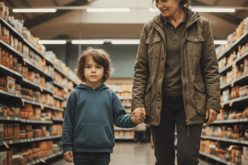 At the store, she walked half a step behind me at first. Not from fear exactly, but from habit. Like she was used to staying out of the way. I slowed my pace without saying anything, and eventually she drifted closer until her sleeve brushed mine.