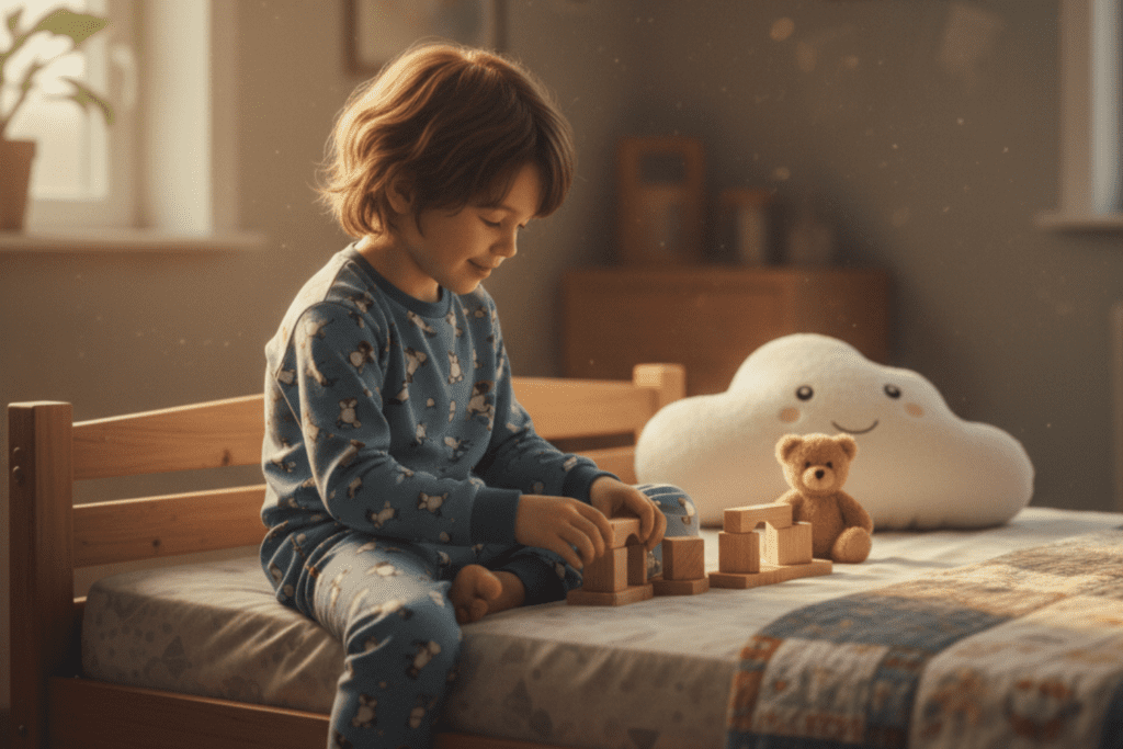 She lined her toys neatly along the edge of the bed, not playing yet. Just arranging. Making sure they were real.