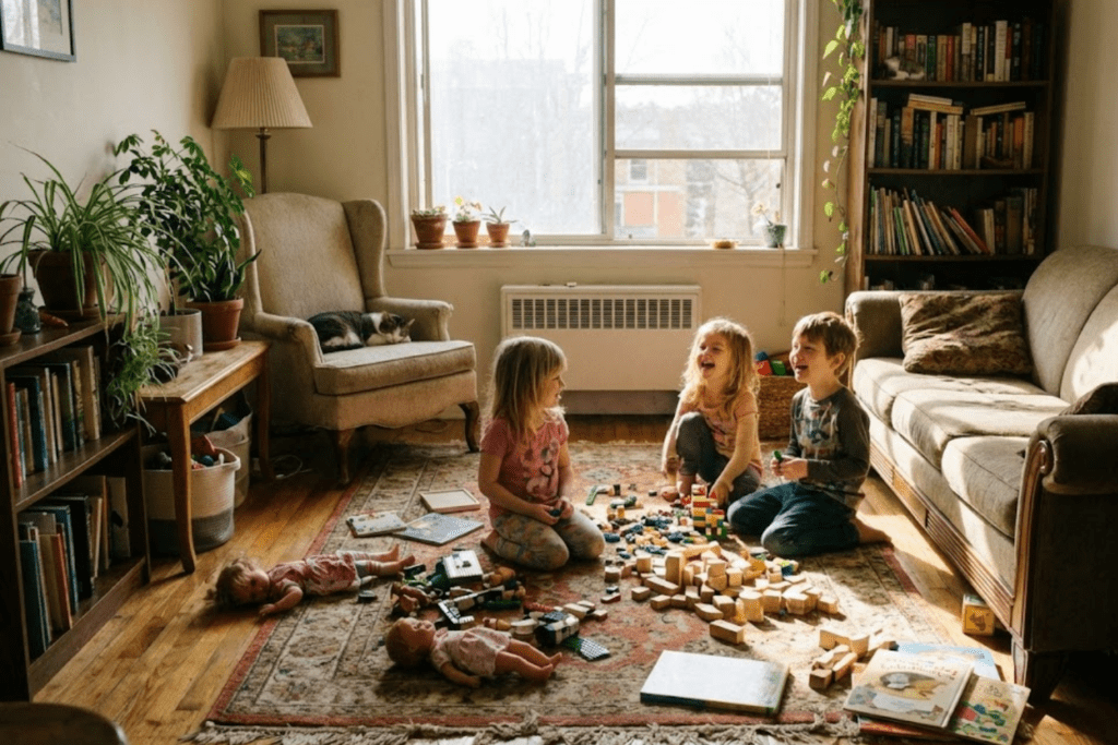 A small apartment living room. Secondhand couch. Toys scattered across the floor. Sunlight pouring through a window onto a patch of carpet where four children sat playing a board game.