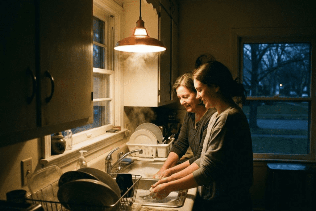 After dinner, she helped me wash dishes like she always had. No fuss, no ceremony. Just hands in warm water, plates passing back and forth.