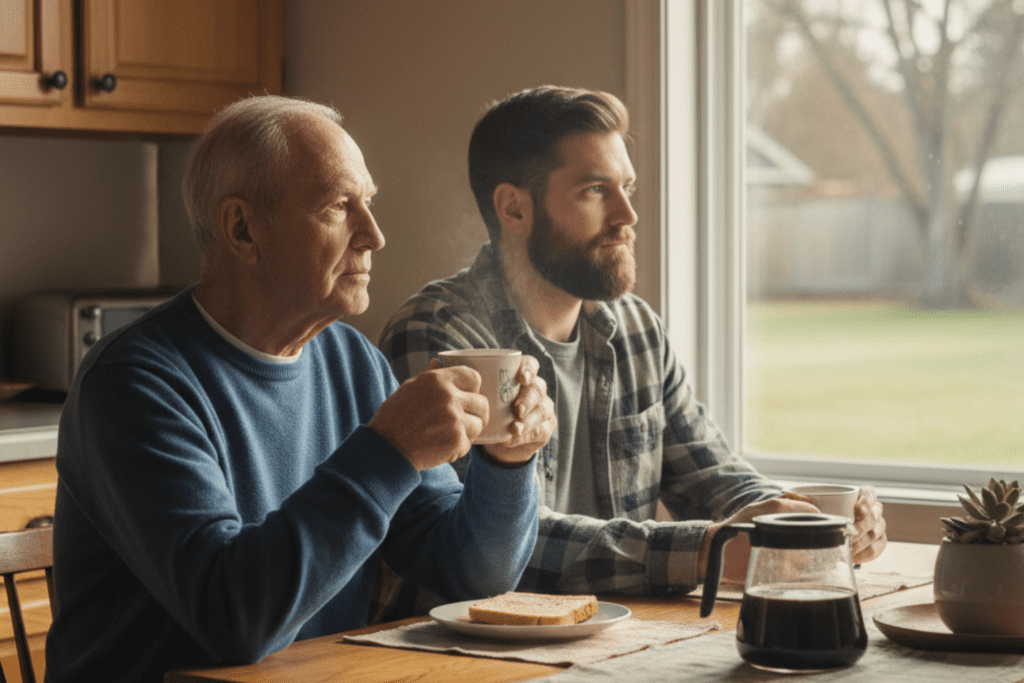 I found him at the kitchen table, hands wrapped around a mug, staring out at the backyard.