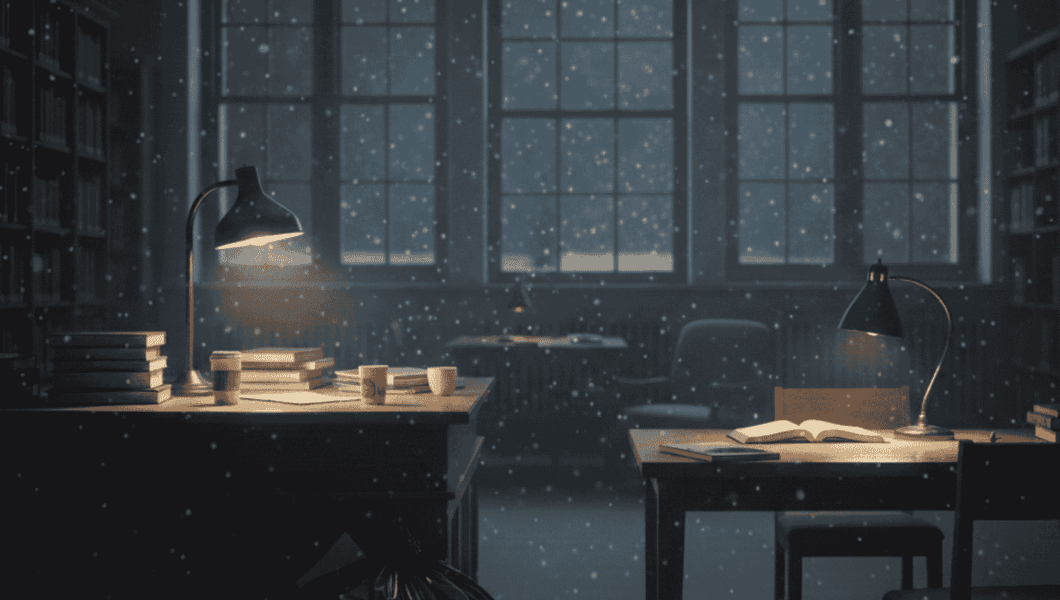 The overhead lights were already off. Only the desk lamp at circulation glowed, casting a warm circle over the returns bin and the stack of books I’d set aside for reshelving. The rest of the library sat in that blue-gray quiet that comes after a storm.