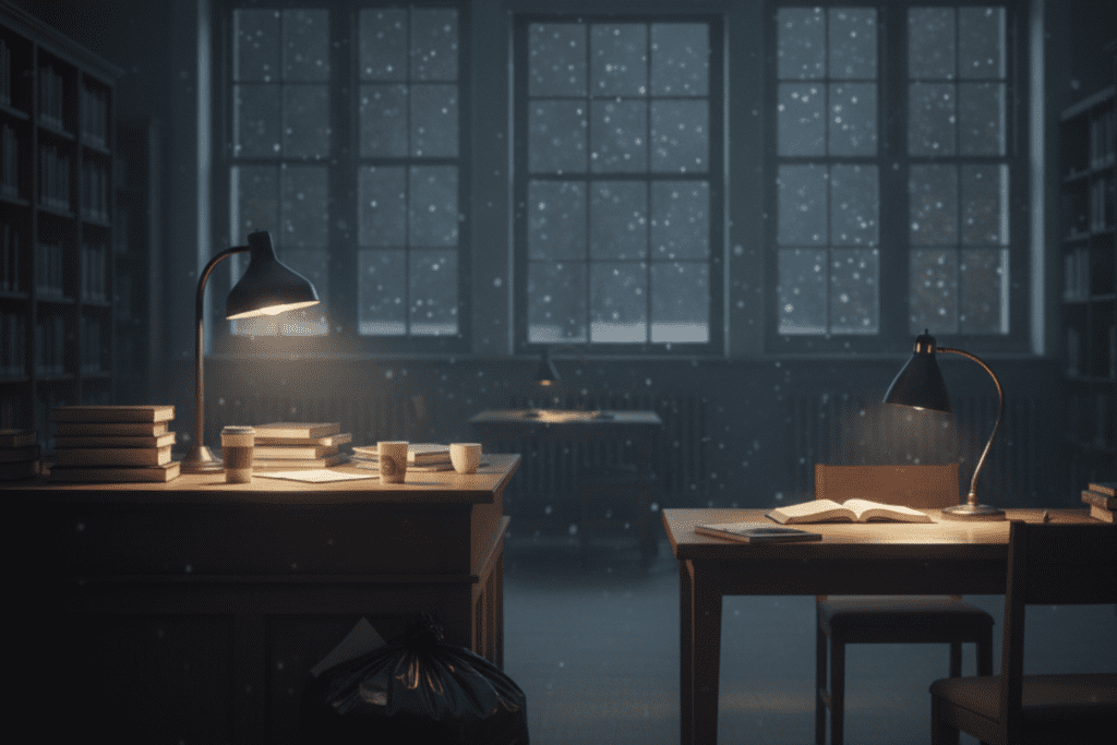 At 11:46 PM, I was standing alone in the library with a trash bag in my hand, pulling printed screenshots off the tables like they were dead leaves.