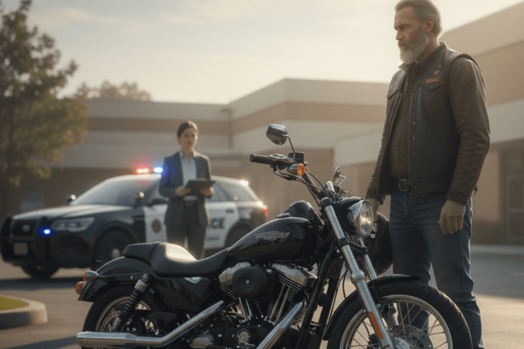 He looked at my Harley, then at my vest, then back at me. I watched his expression flicker. He recognized the patch. He measured the risk.