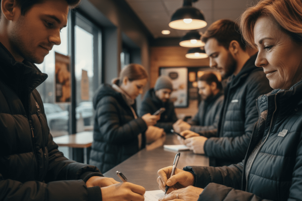 A man in construction gear stepped up and immediately reached for the notepad without being prompted. A woman with earbuds took one out and pointed to her ears apologetically, then smiled when Jason nodded in understanding. The exchange was smooth, almost invisible.