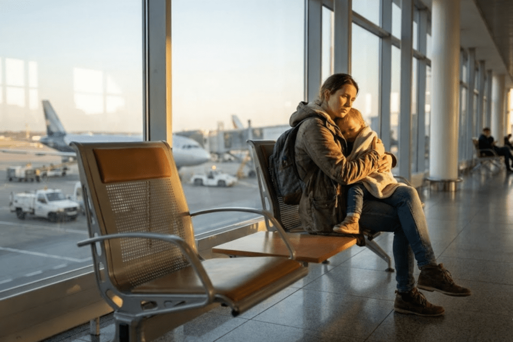In the terminal, everything rushed back to life. Rolling suitcases clicked across the floor. Voices echoed. Announcements crackled overhead. She followed the signs toward baggage claim, her son still asleep, his small arm draped loosely across her chest.