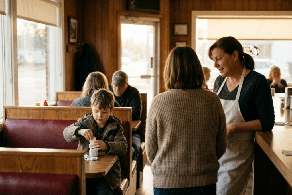 We slid into a booth near the window. The same worn vinyl. The same laminated menus. I noticed myself scanning the room before we even sat down, half-expecting to see the older man, or the woman, or some trace of that moment lingering in the air.