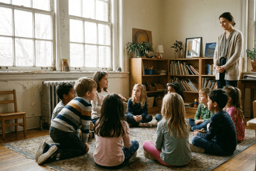 She gestured toward the classroom, where Noah sat with a group of children, listening intently as another boy spoke.
