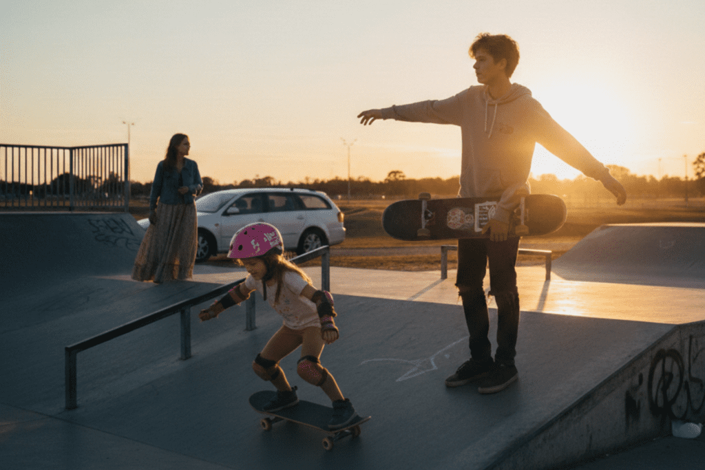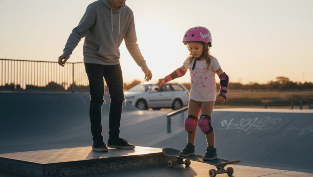 She has been talking about skateboarding for months. Not once or twice. The kind of talking that comes with watching videos, pointing things out in stores, asking questions while brushing her teeth, and trying to copy foot placement on the carpet in the living room.