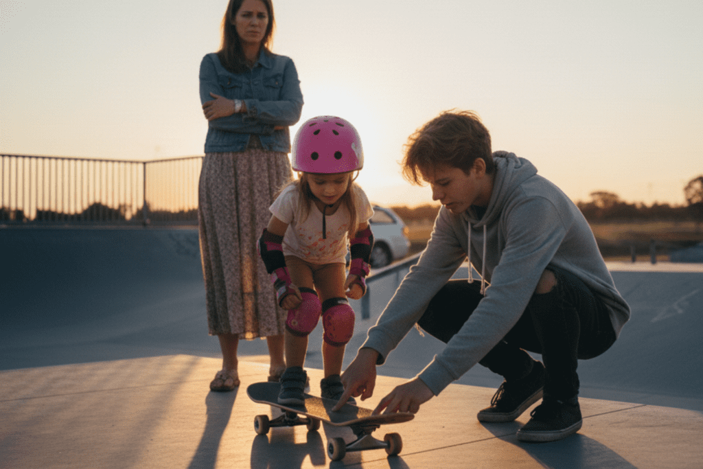 Cinematic, ultra-realistic documentary-style image of the girl rolling down a small ramp with concentration, knees bent correctly. The teenage boy stands nearby ready to catch her if she falls, focused and patient. The mother watches from the side with a softened expression. Natural light, realistic motion blur, no text, no watermark.
