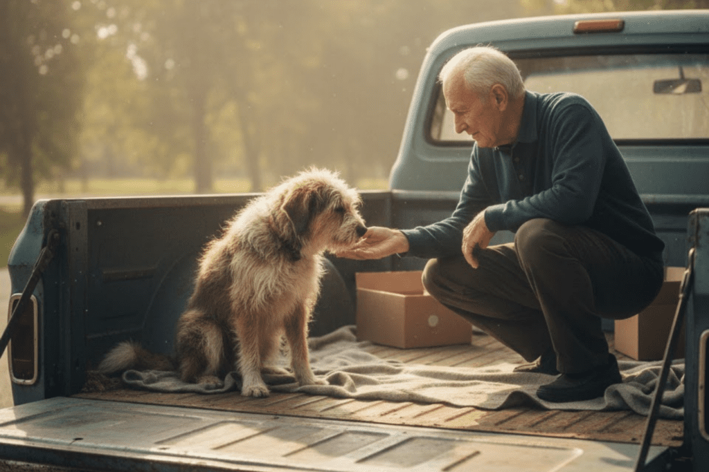 He didn’t tell anyone at first. He just showed up one day with a scruffy gray mutt waiting patiently in his truck.