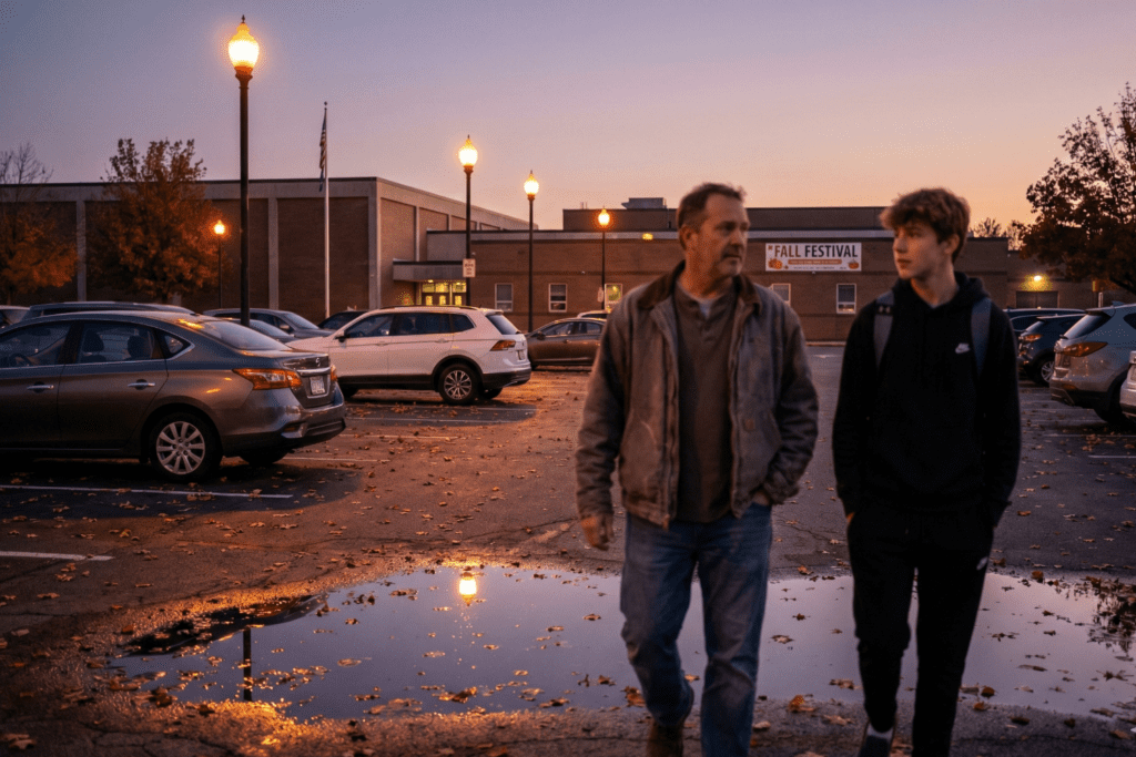 The parking lot was nearly empty when we finally stepped outside the school auditorium. The air had that sharp evening chill that settles in after sunset, the kind that makes you pull your jacket tighter without really thinking about it. Streetlights hummed softly above us, casting long shadows across the pavement. For a moment, neither my son nor I spoke. It felt wrong to break the quiet too quickly, like the silence itself deserved respect.
