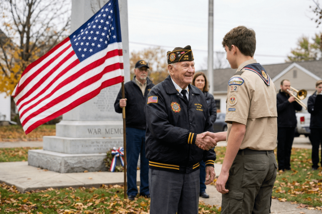 A month later, we attended a local Veterans Day ceremony. Smaller than the school event. No reporters. No stage lights. Just folding chairs, a flag, and a handful of older men and women standing a little straighter when the anthem played.